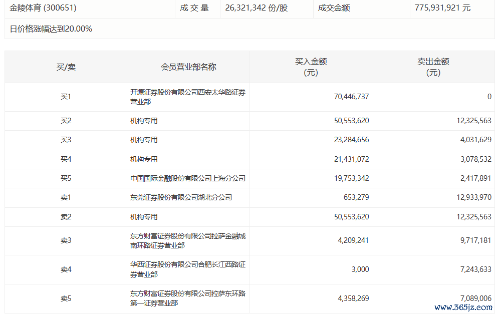 金陵体育今日涨20.00% 3家机构专用席位净买入7583.36万元金陵体育今日涨20.00% 3家机构专用席位净买入7583.36万元