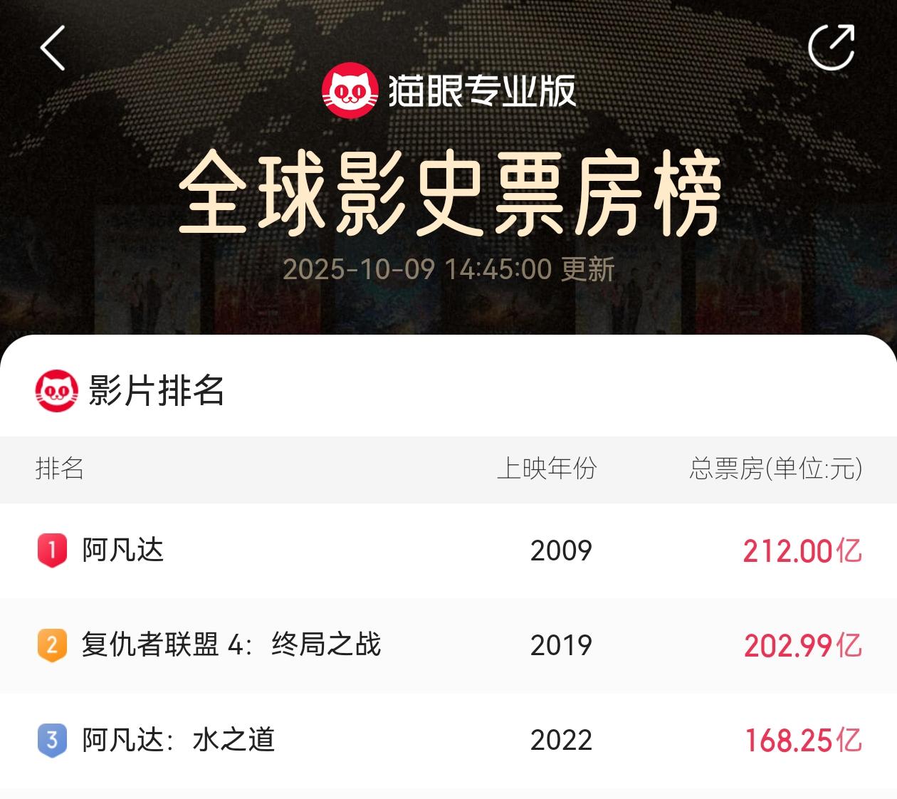 据猫眼专业版全球影史票房榜显示,2009年,首部《阿凡达》电影全球票房高达212亿元,至今仍稳居影史票房之冠。第二部《阿凡达:水之道》于2022年再续传奇,以168.25亿元的全球票房跻身影史第三。